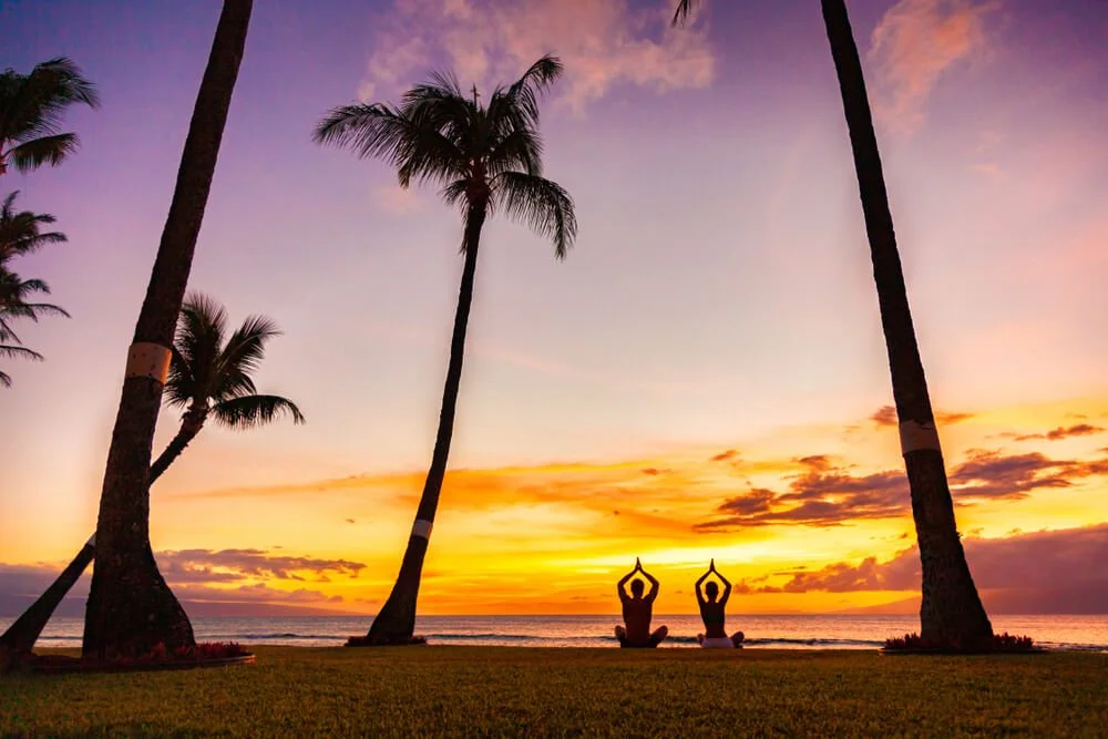 Breathwork under palm trees.